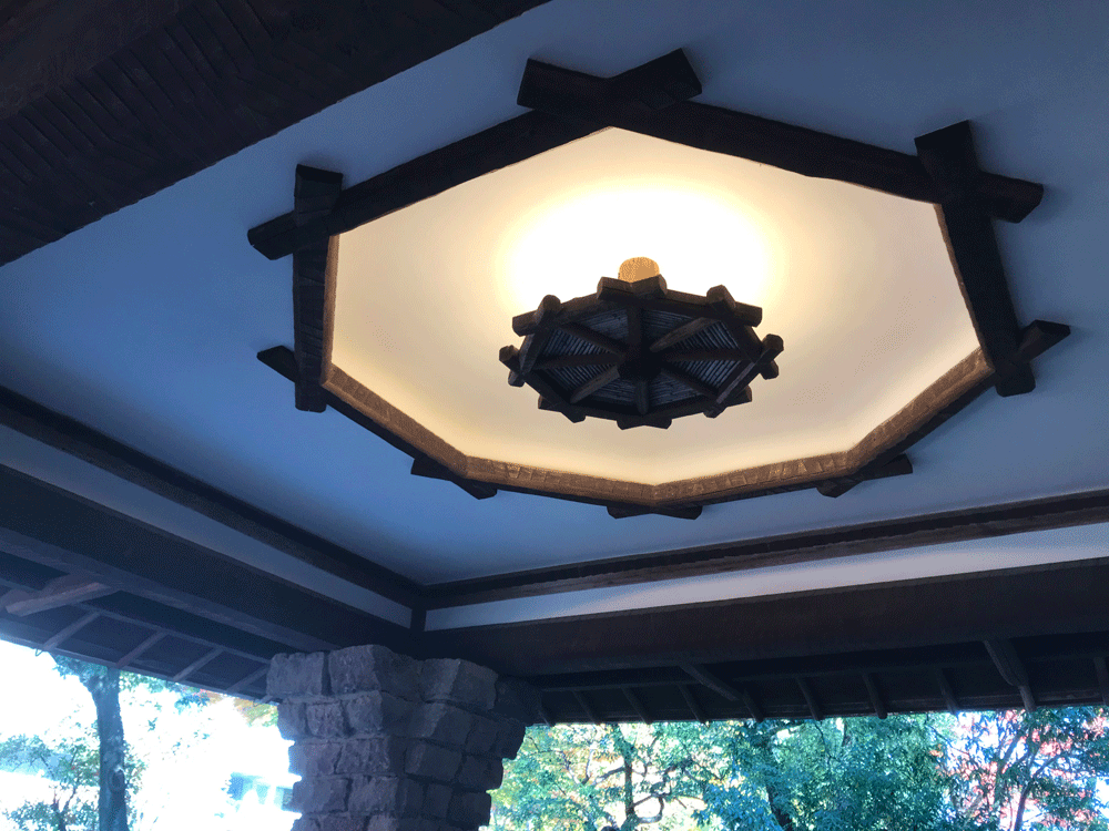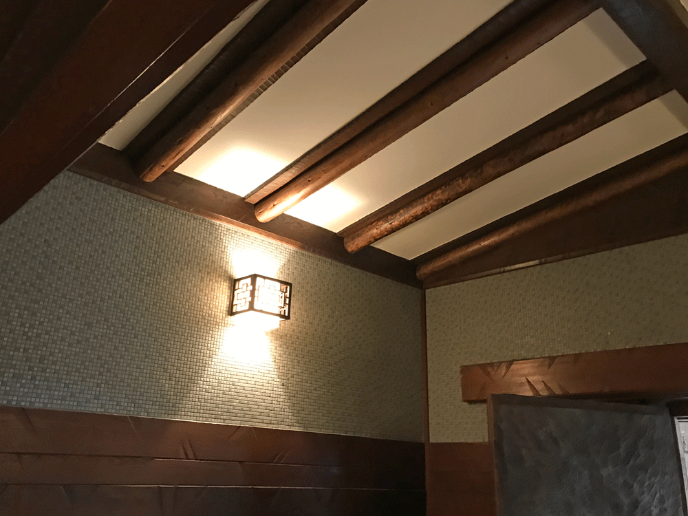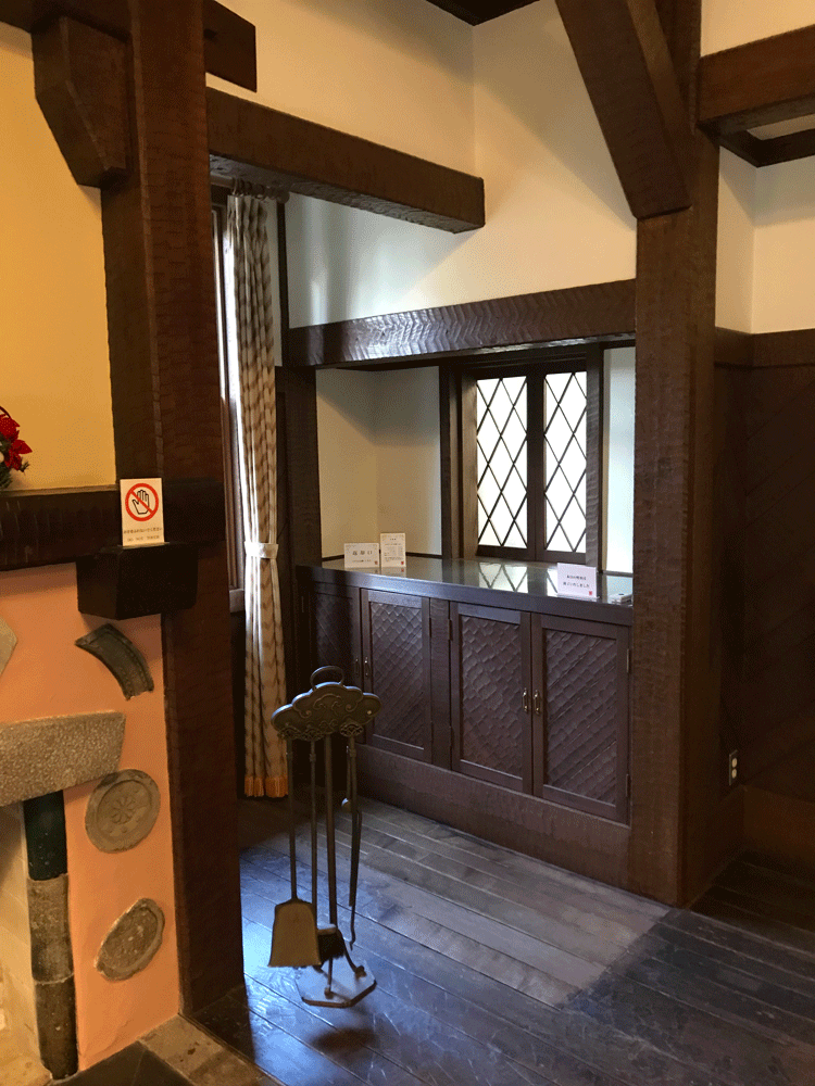 様々な意匠が施されたこの山荘風空間で晩餐会が開催されました。暖炉には有名寺院などの発掘古瓦がはめ込まれており、東寺や西寺、善光寺などの文字が読み取れます。