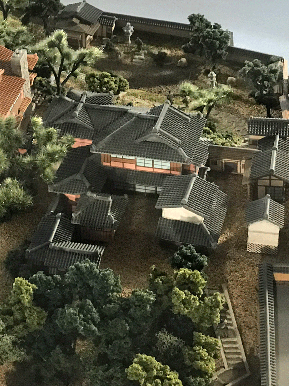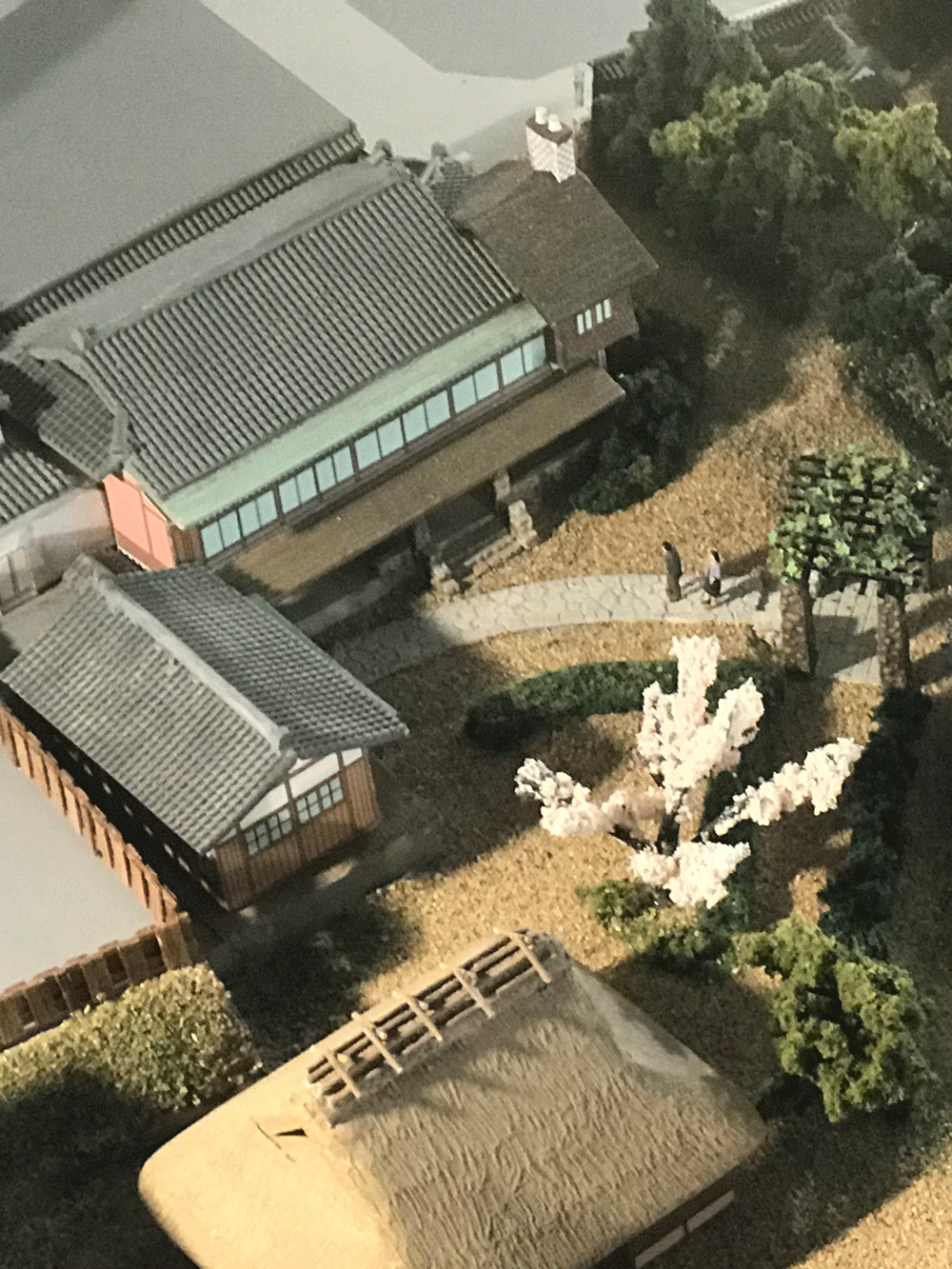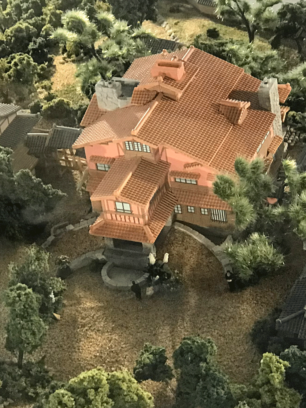 1階展示室にあるジオラマ:下の赤い建物が聴松閣、上の煙突のある建物が伴華楼、中央には今は現存しない有芳軒やテニスコート、温室、弓道場なども見て取れます。