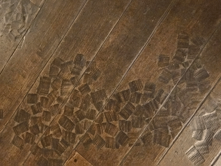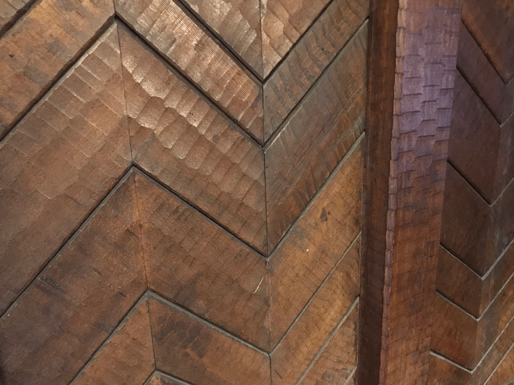 板壁部分は幅の異なる板を斜め貼りに、床材はランダムに彫りこむことでリズム感を演出しています。