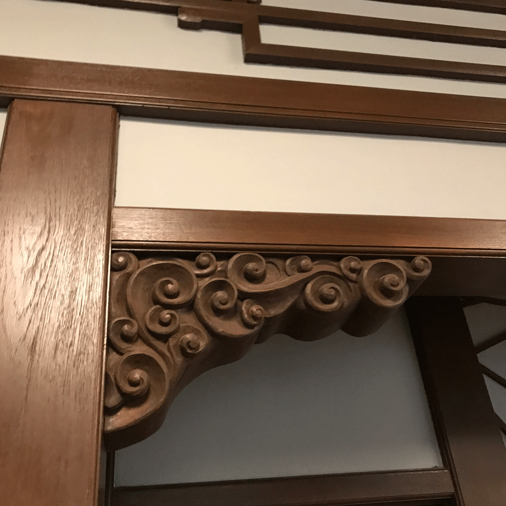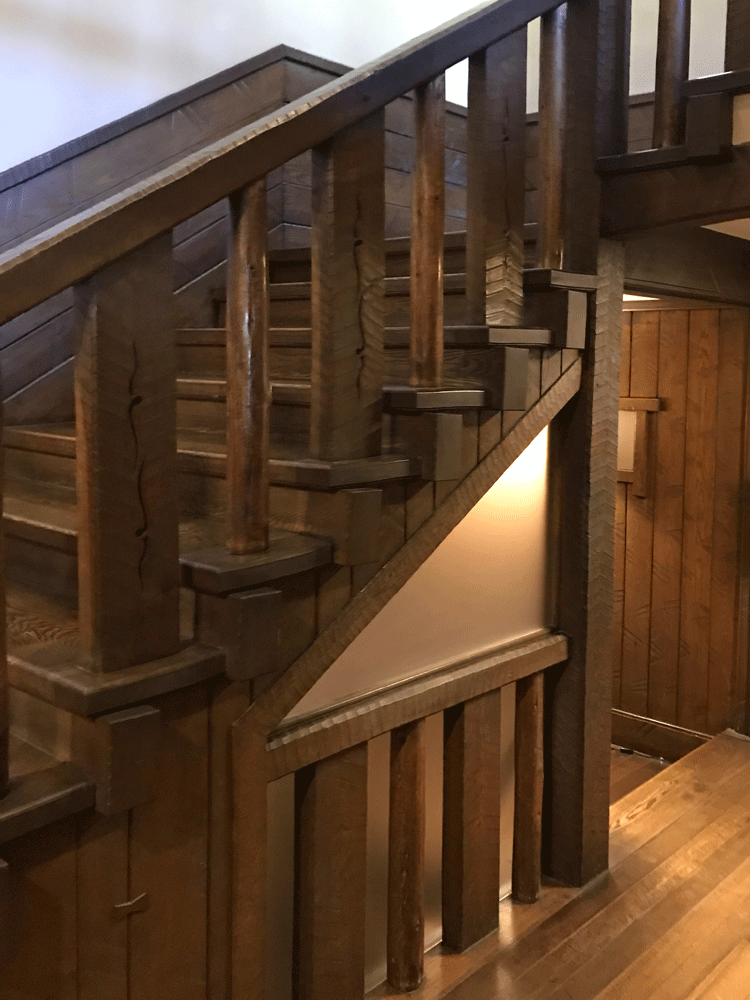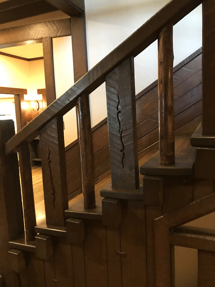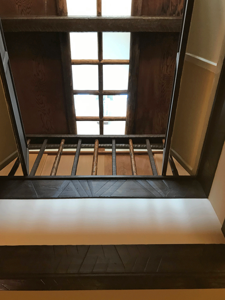 階段手摺は透かし彫りを施した太い角材と細い丸材を交互に配した凝った意匠。