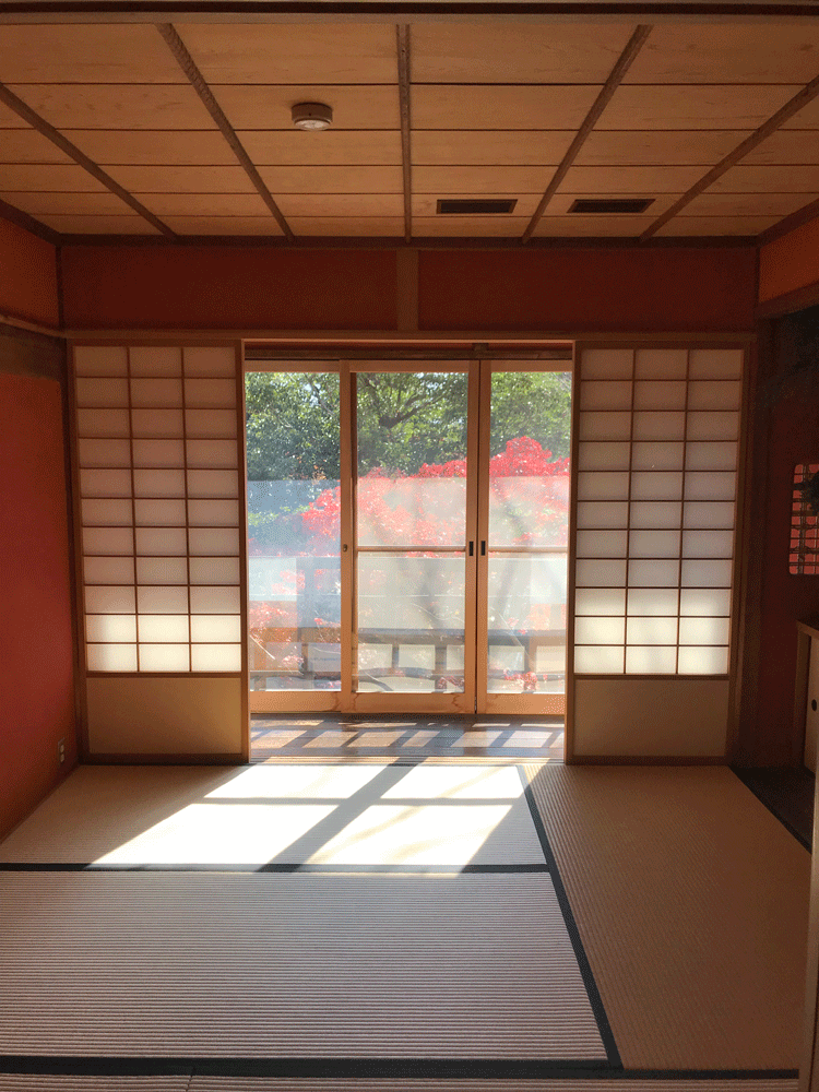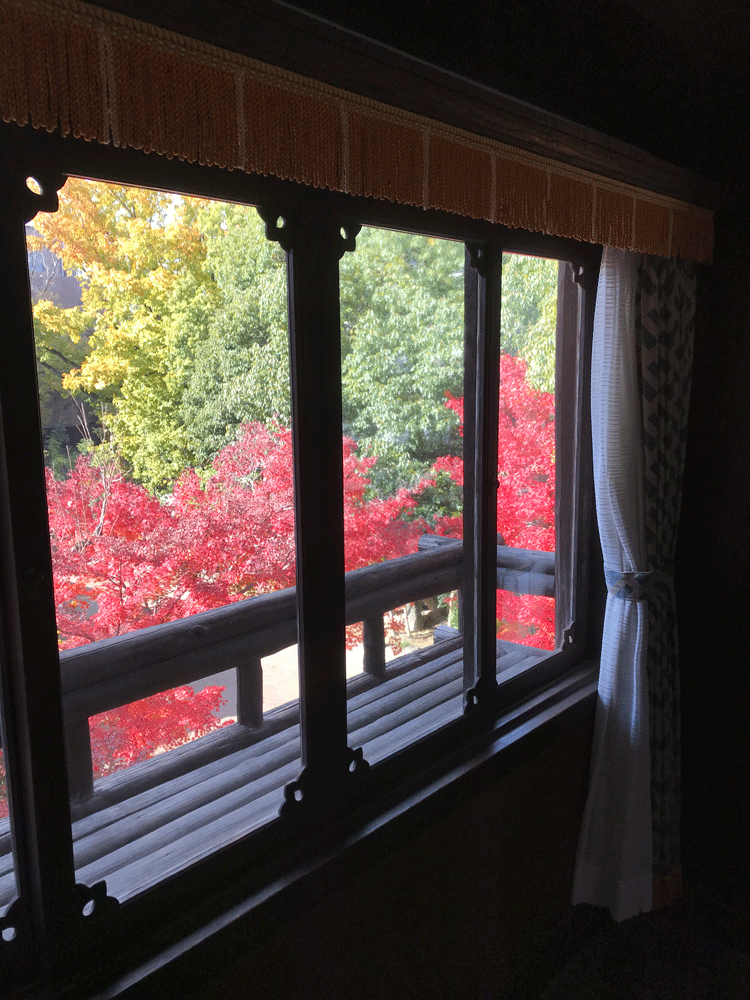 聴松閣2階の階段ホールからの眺め。べんがら色の外壁と紅葉が調和し趣のある風情です。