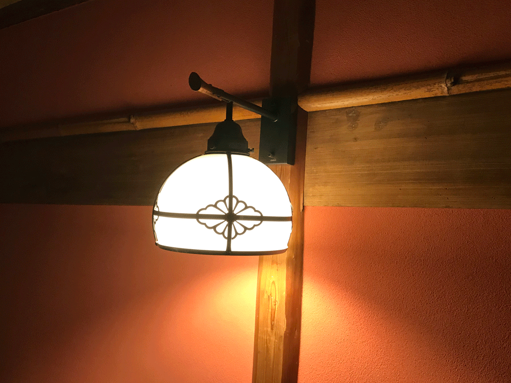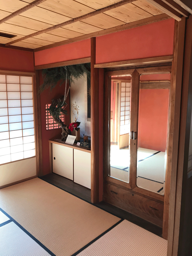 聴松閣唯一の和室。べんがら色の壁、竹長押、面皮付柱など数寄屋風にしつらえられています。お客様はここでお召し替えをされたそうです。