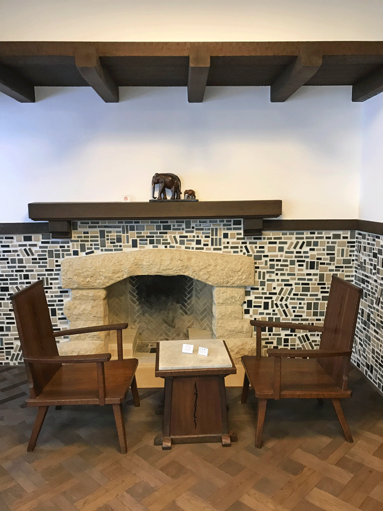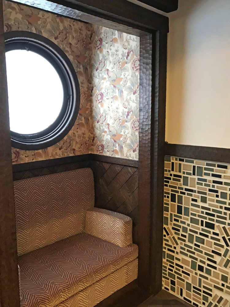 暖炉のある応接室は楽しかった旅行の思い出が込められて。画像左奥の丸窓とソファーのあるコーナーは一等船室をイメージ。オウム柄の壁紙が貼られてトロピカルでエキゾチックな印象です。この壁紙はホールのコーナーにも貼られていました。復元された暖炉とタイルは航海中に見た波がしらの立つ海のイメージだそうですよ。