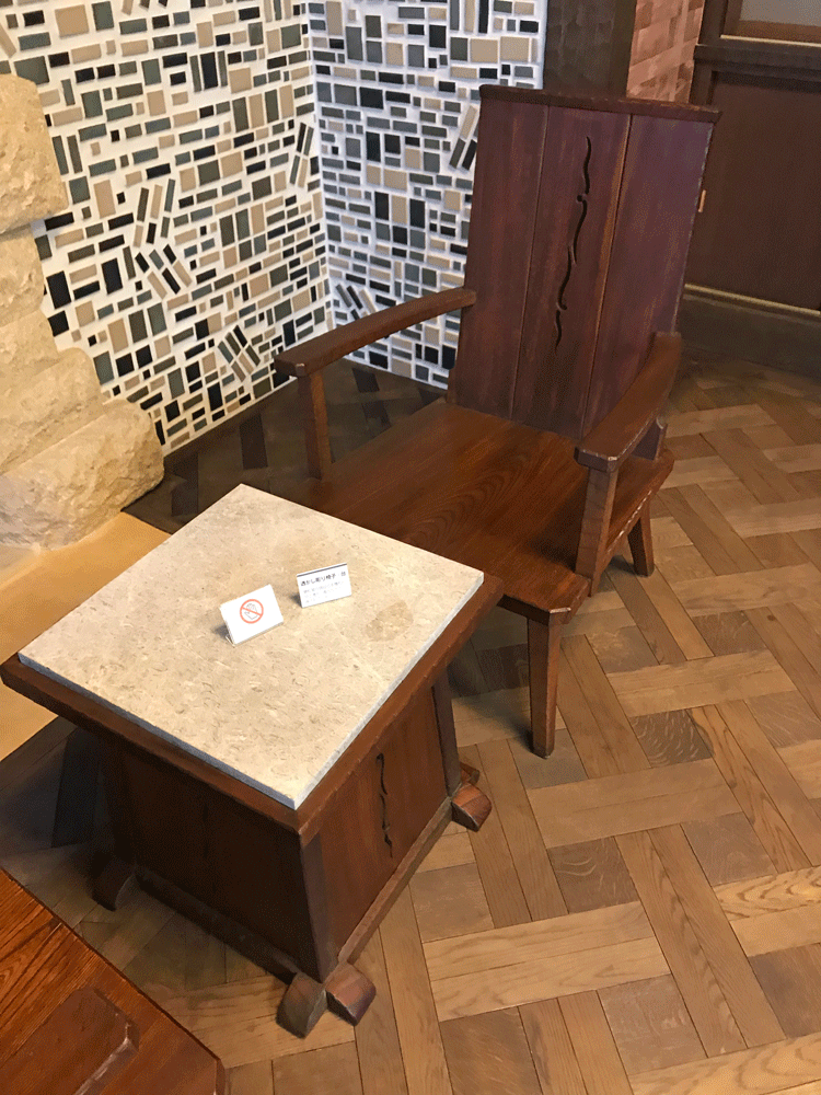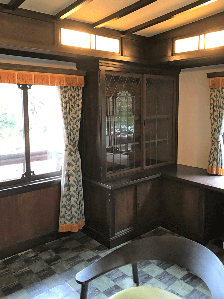 部屋の四隅にはステンドグラスの硝子戸が付いた造り付けの書棚が据えられています。画像右奥の写真の飾ってある書棚は、GHQによりカービン銃置き場として改変されたもの。