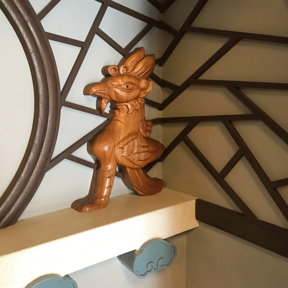 天井の鳳凰、復元された暖炉の上の木鶏や氷裂、筋斗雲のような文様など、中国風の装飾が施された来客用の寝室。