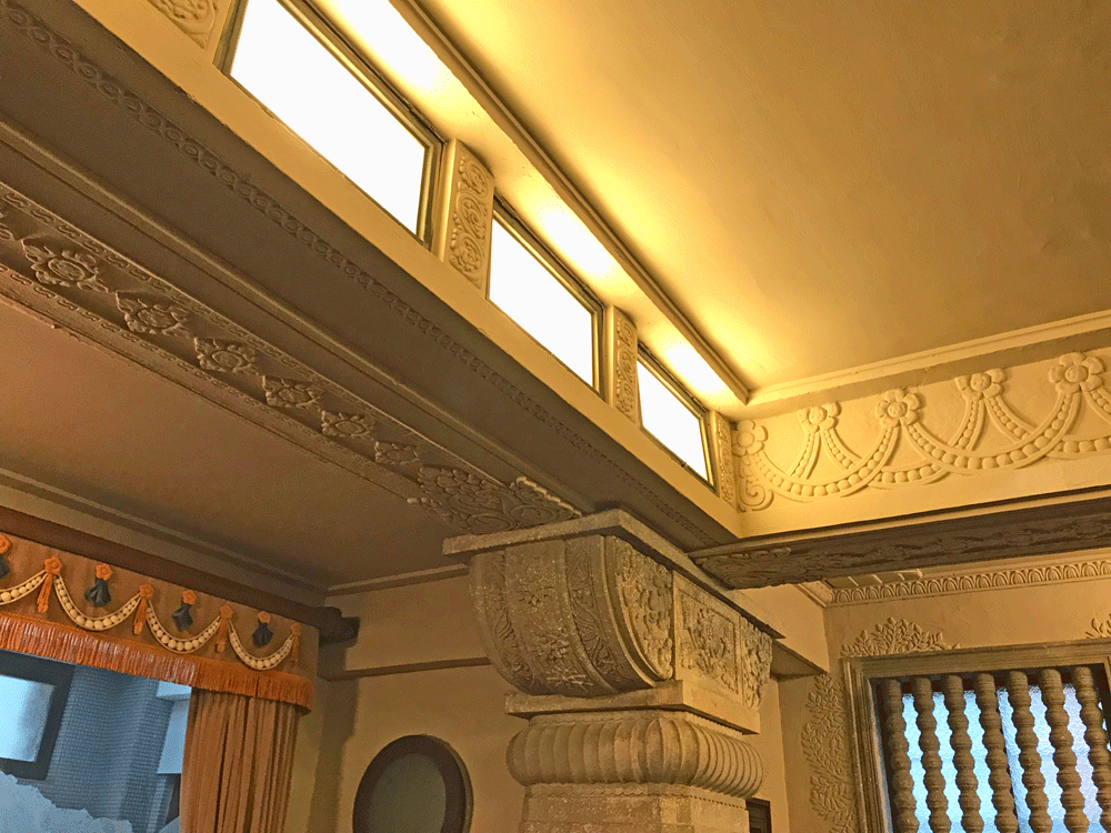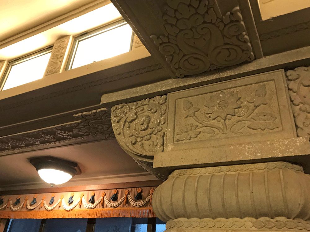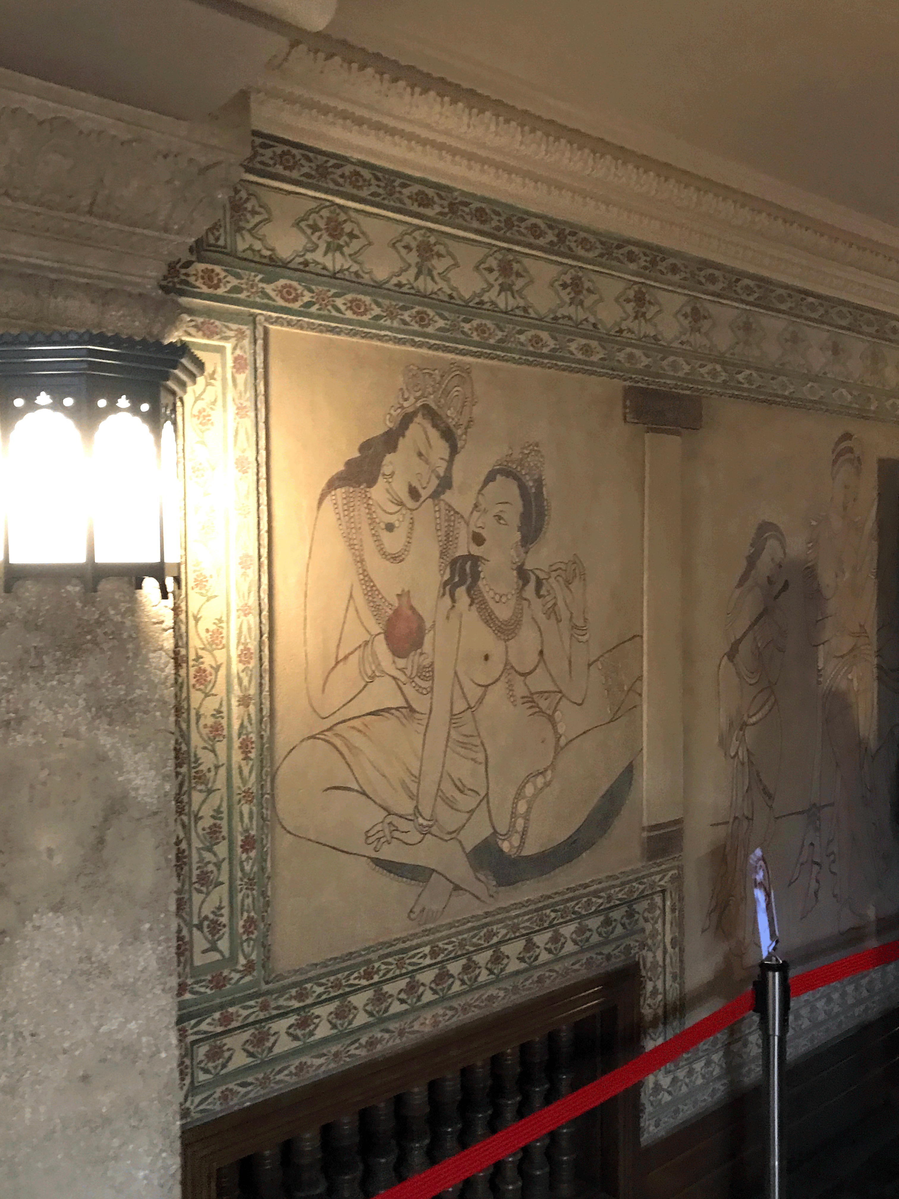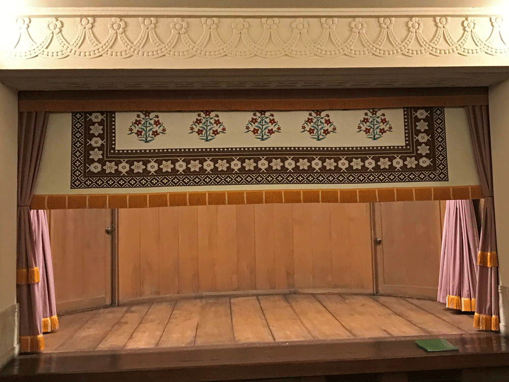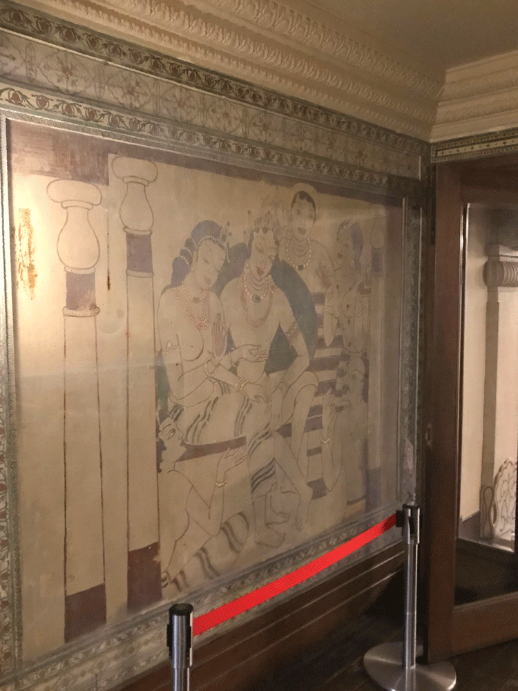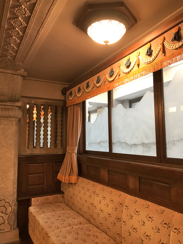 蓮華文様など、いたるところにインドや東南アジア風の様々な意匠が施されています。梁とカーテンの上飾りには真珠のネックレスのような意匠が繰り返されて優雅な雰囲気。