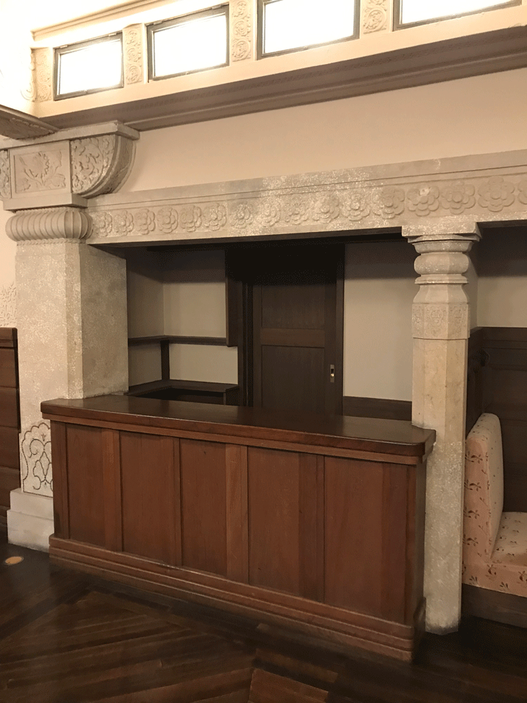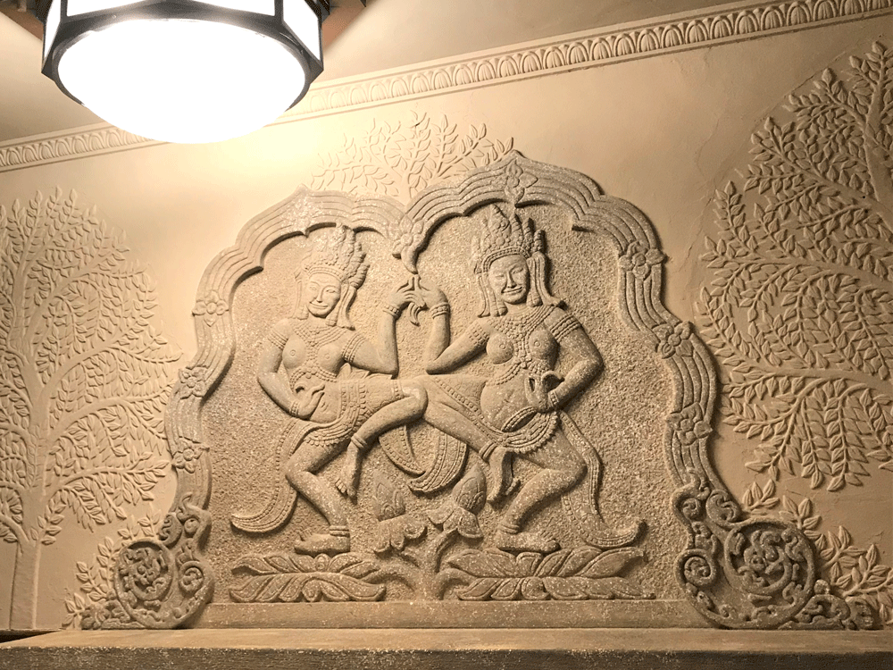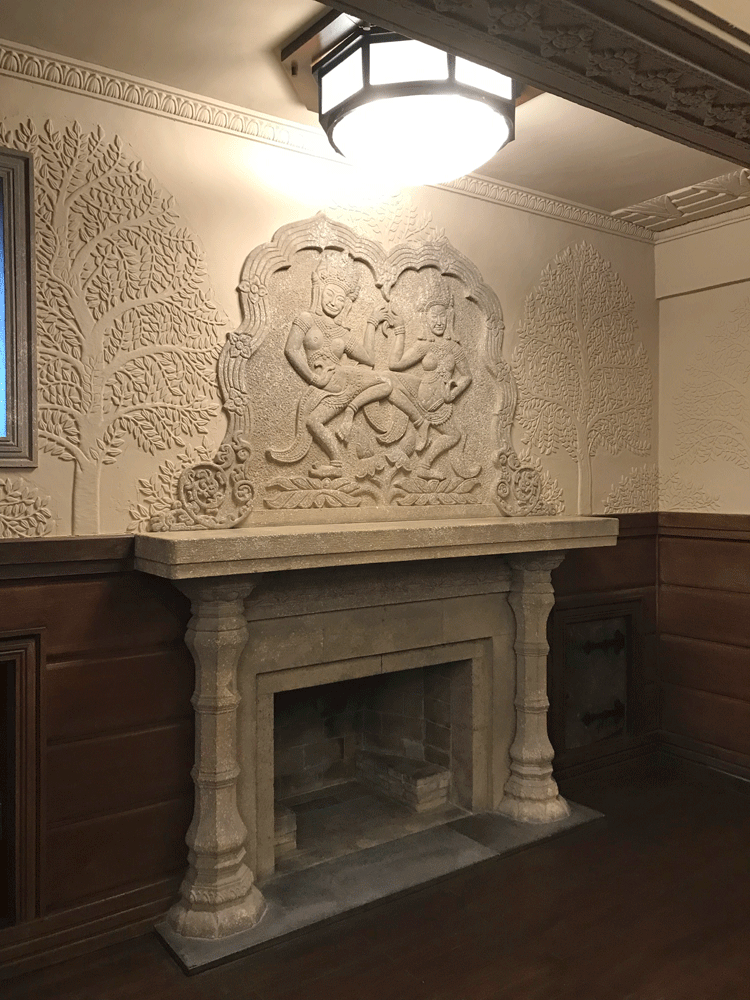 暖炉の上の踊り子のレリーフはカンボジアのアンコールトムの彫刻を模したもの。その横に彫られている樹々は、ブッダがその木の根元に座り悟りを得たという菩提樹です。