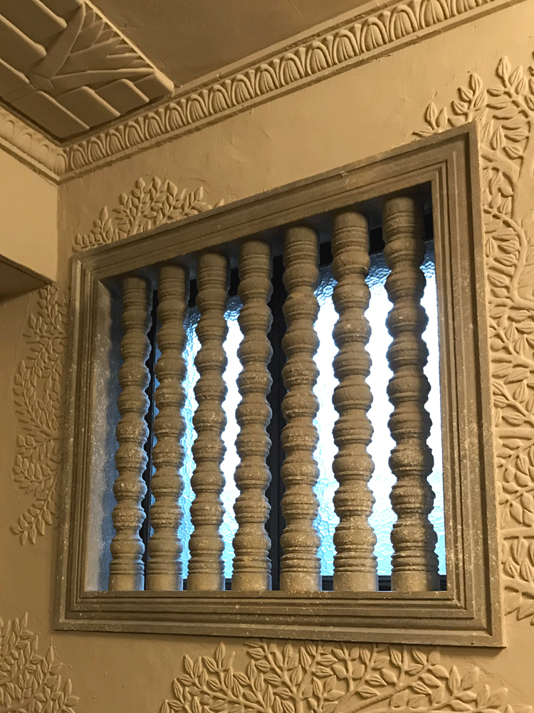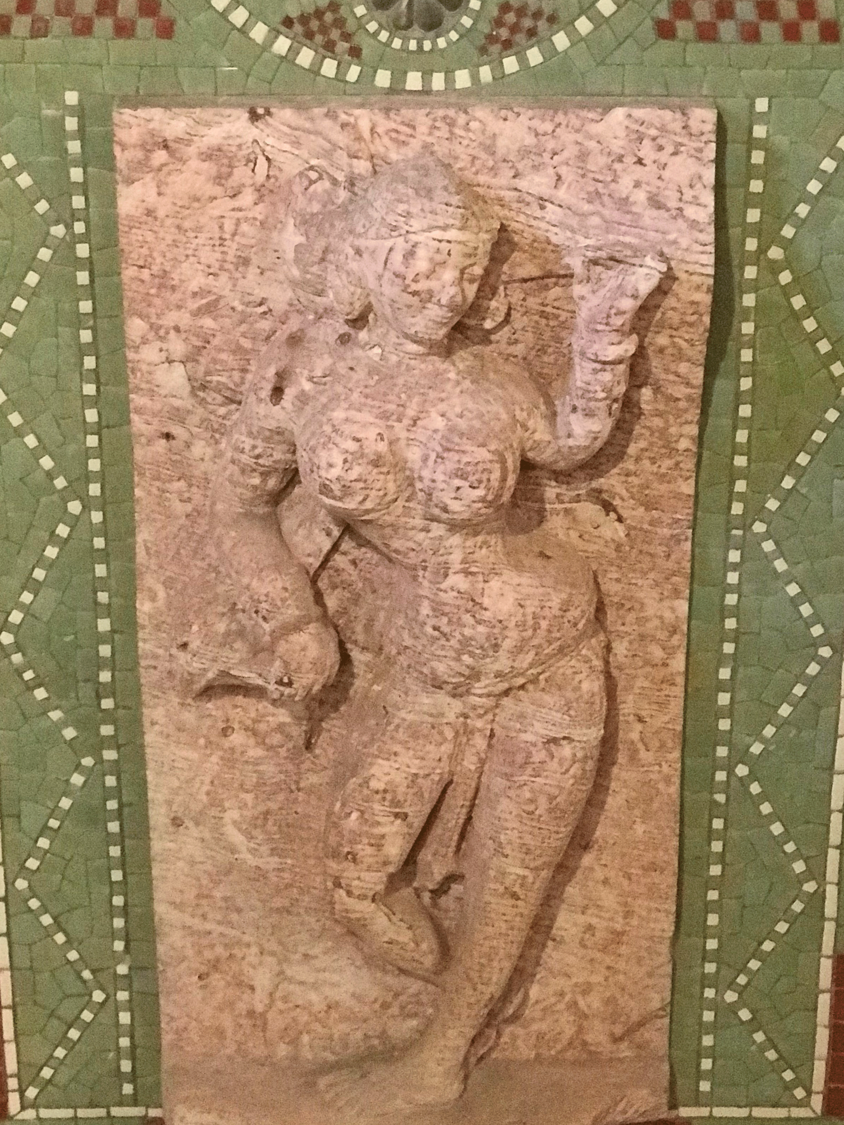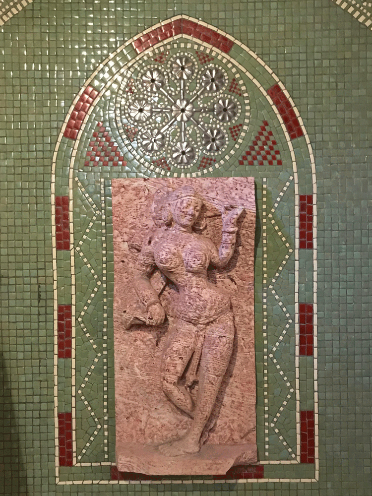 トンネルの入り口上部には、ホールに見られるものと同様のインド風アーチのレリーフが施されてミステリアスな雰囲気を醸し出しています。アジャンタ石窟の写しといわれています。その手前の壁には水色と白っぽいモザイクタイルがストライプ状に貼られています。