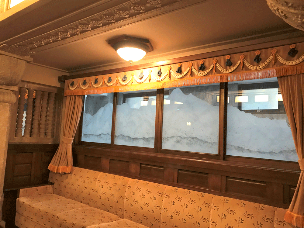 南側の窓にはヒマラヤ連峰の雪嶺を描いたエッチングガラスがはめ込まれています。一番高い峰が世界第3峰のカンチェンジュンガだそうです。