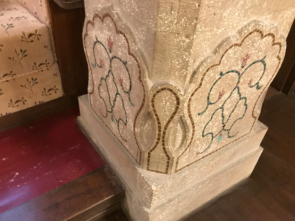 石貼りの柱の根元にはインドのアーグラ宮殿に見られる植物模様の象嵌が施されています。