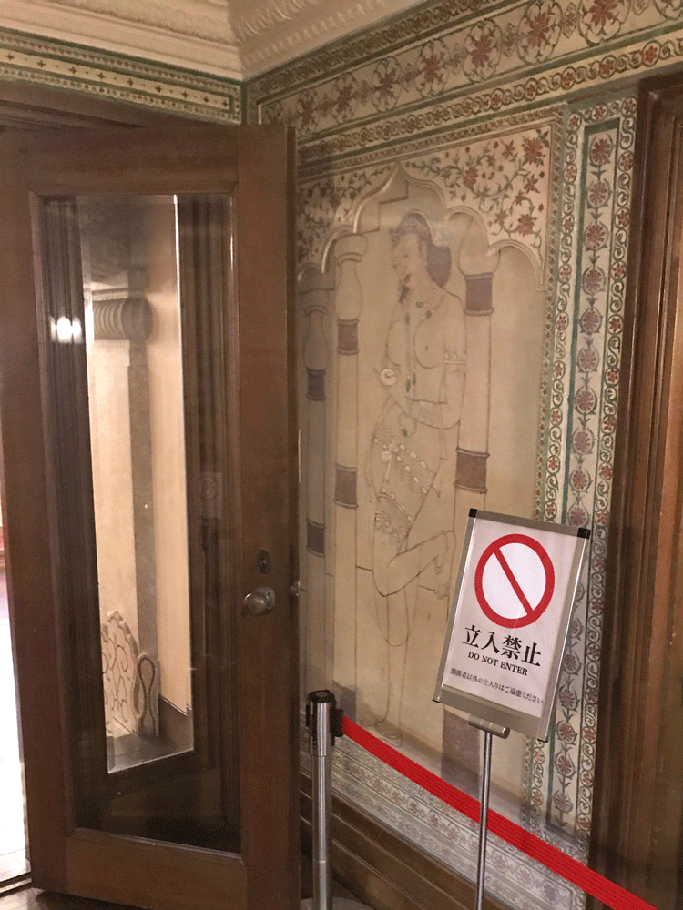 遊び心溢れる揚輝荘の中でも、インドやアジアの影響が色濃い地階は、ひときわ異彩を放つミステリアスな空間です。晩餐を終えられたお客様は、この旧舞踏場に移動し、お酒やダンスを愉しまれたということです。